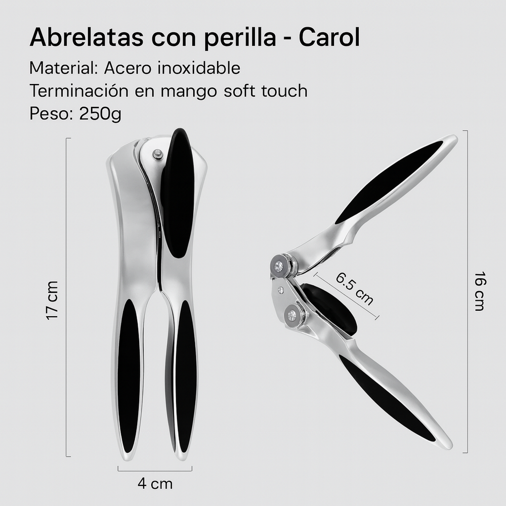 Práctico, resistente y fácil de usar, este abrelatas manual de la marca Carol está diseñado para abrir todo tipo de latas de manera rápida y segura. Su estructura de acero combinado con mangos ergonómicos antideslizantes brinda un agarre firme y cómodo, evitando el deslizamiento durante el uso.