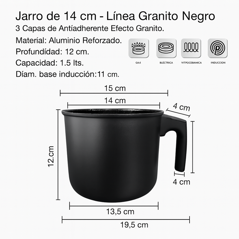 Un infaltable en tu cocina para calentar agua, leche o preparar infusiones de manera rápida y uniforme. Fabricado en aluminio forjado de alta calidad con 3 capas de antiadherente efecto granito, ofrece mayor durabilidad, fácil limpieza y evita que los alimentos se peguen.